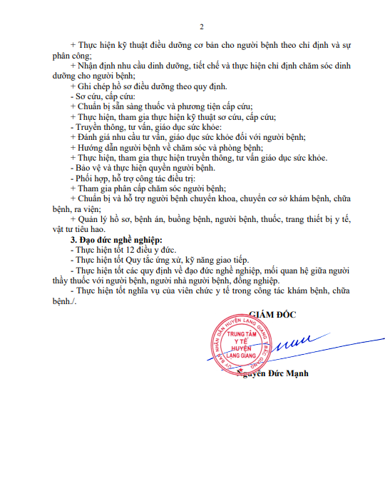 Cơ cấu tổ chức Trung tâm Y tế huyện Lạng Giang Cơ cấu tổ chức bộ máy của TTYT cụ thể như sau: Trung tâm có tổng số 20 khoa phòng: 06 phòng chức năng, 14 khoa chuyên môn và 23 trạm Y tế xã, thị trấn trực thuộc. 1. Ban giám đốc: 01 Giám đốc, 04 Phó Giám đốc. 2. Tổng số khoa, phòng: 06 phòng chức...